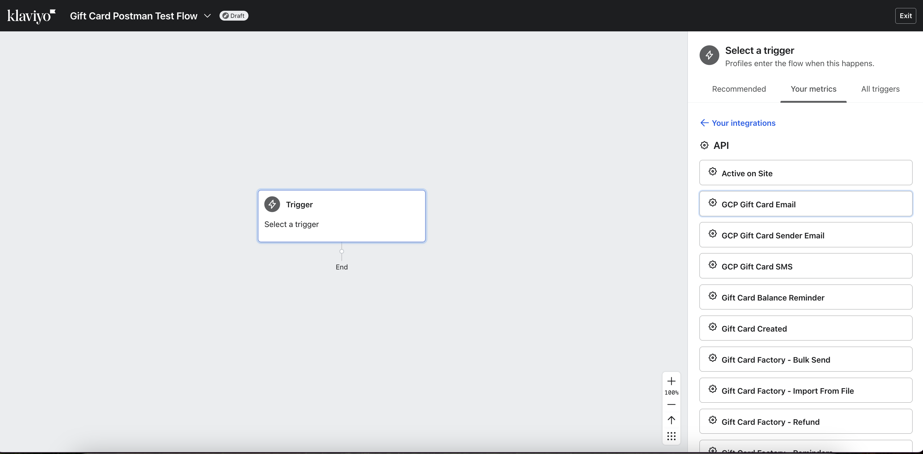 From the tabbed menu on the right, select Your Metrics β API. Now find the Gift Card Factory metrics for which you want to send emails. For the purpose of this guide, we will use GCP Gift Card Email. This metric is registered against a contact in Klaviyo whenever someone purchases a gift card for someone else.