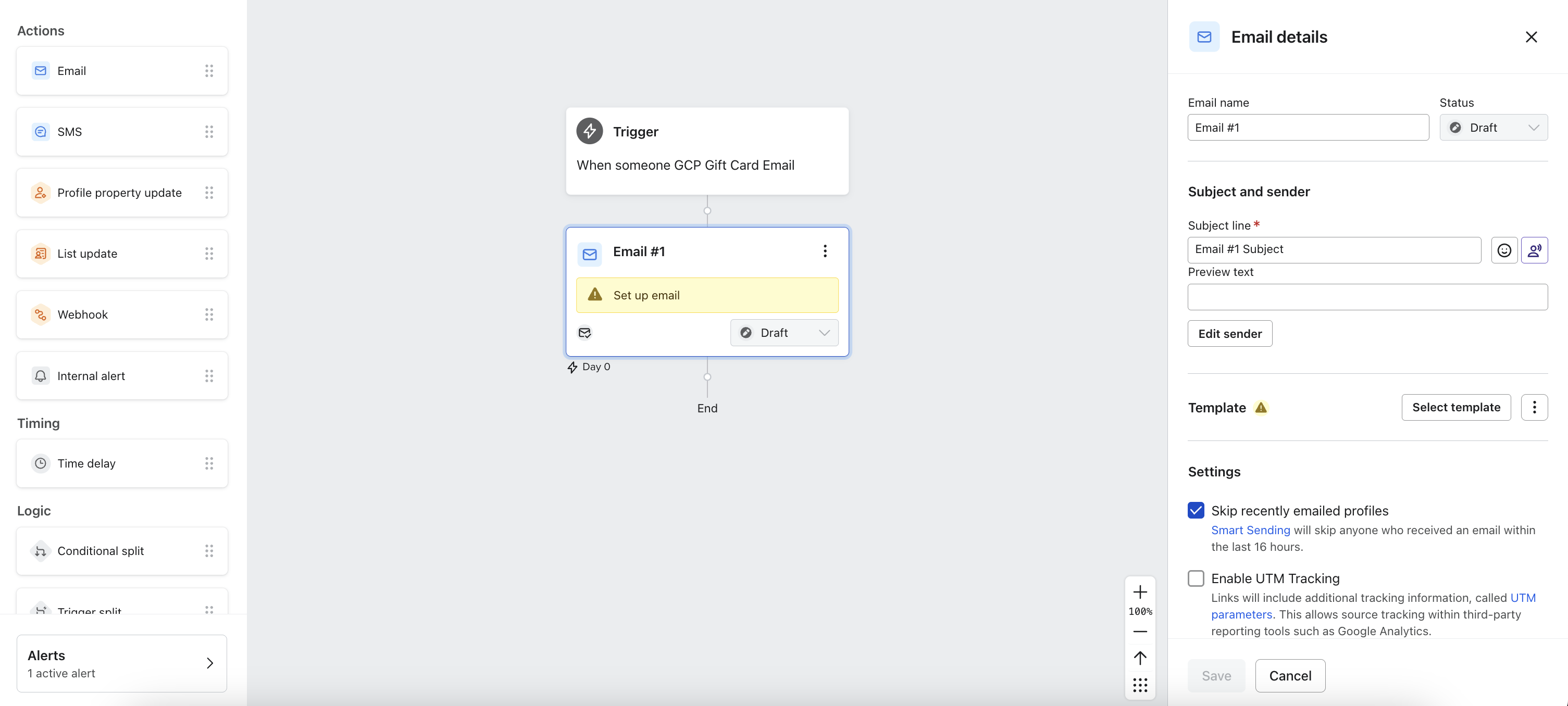 Now you can enable your newly created flow. Click the button in the top-right section. Whenever Gift Card Factory sends the metric, the email will be sent to the contact who received the metric.