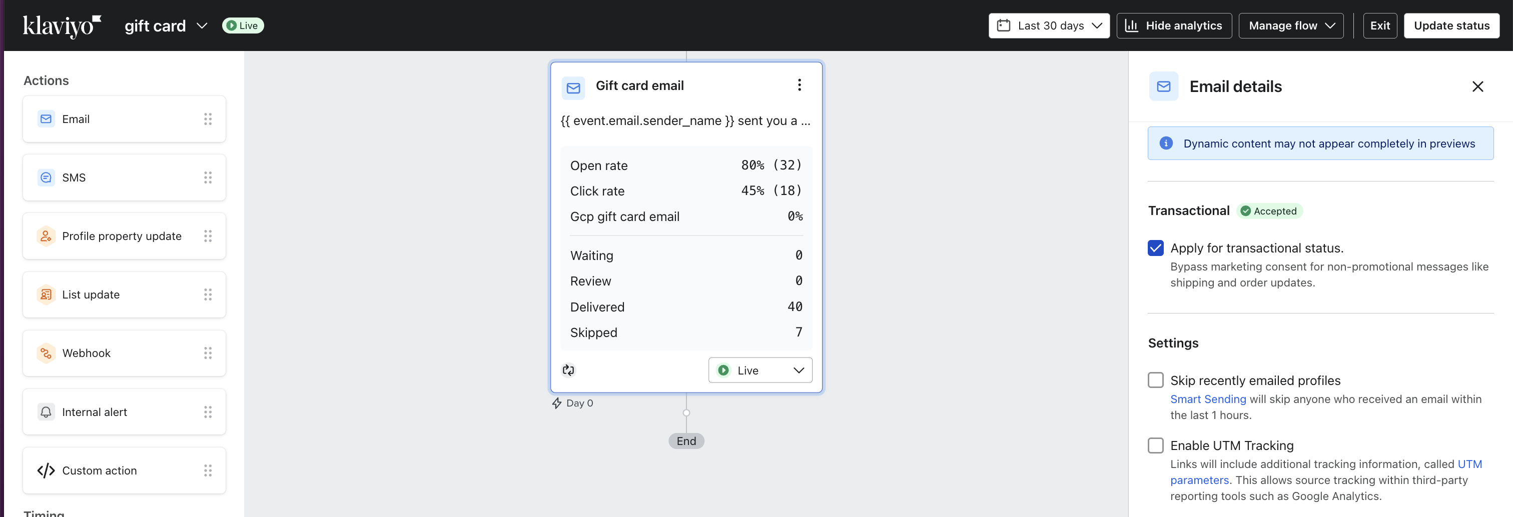 With Klaviyo Flows, you can send emails using Klaviyo templates in response to Gift Card Factory events.